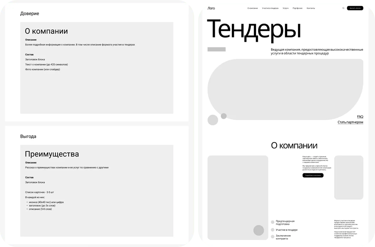 Перед нами стояла цель создать современный, лаконичный ,информативный дизайн для компании-партнера. Редизайн сайта был направлен на формирование нового имиджа компании и создания клиентской лояльности. При этом сайт должен был сохранить свою основную задачу - фокусирование внимание на услугах и конкурентных преимуществах в тендерных закупках.